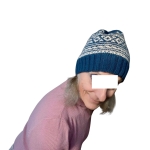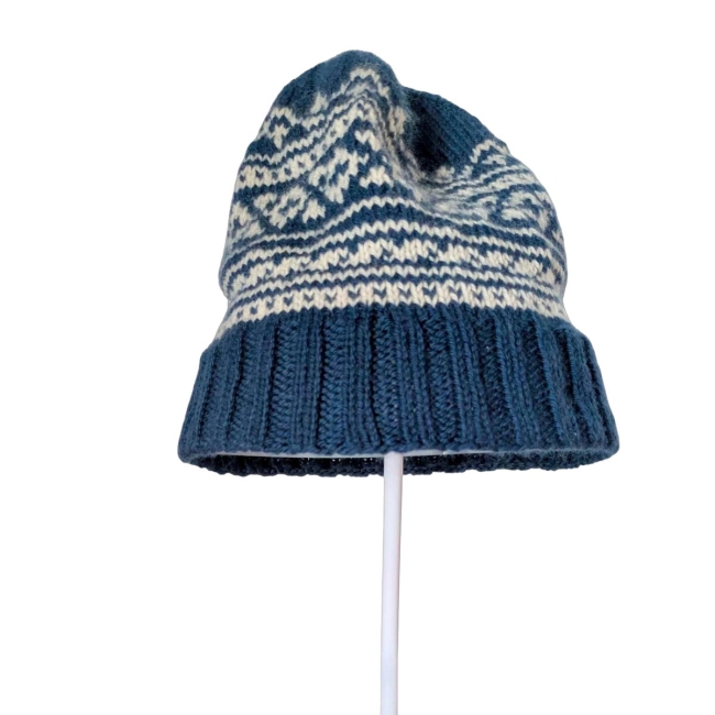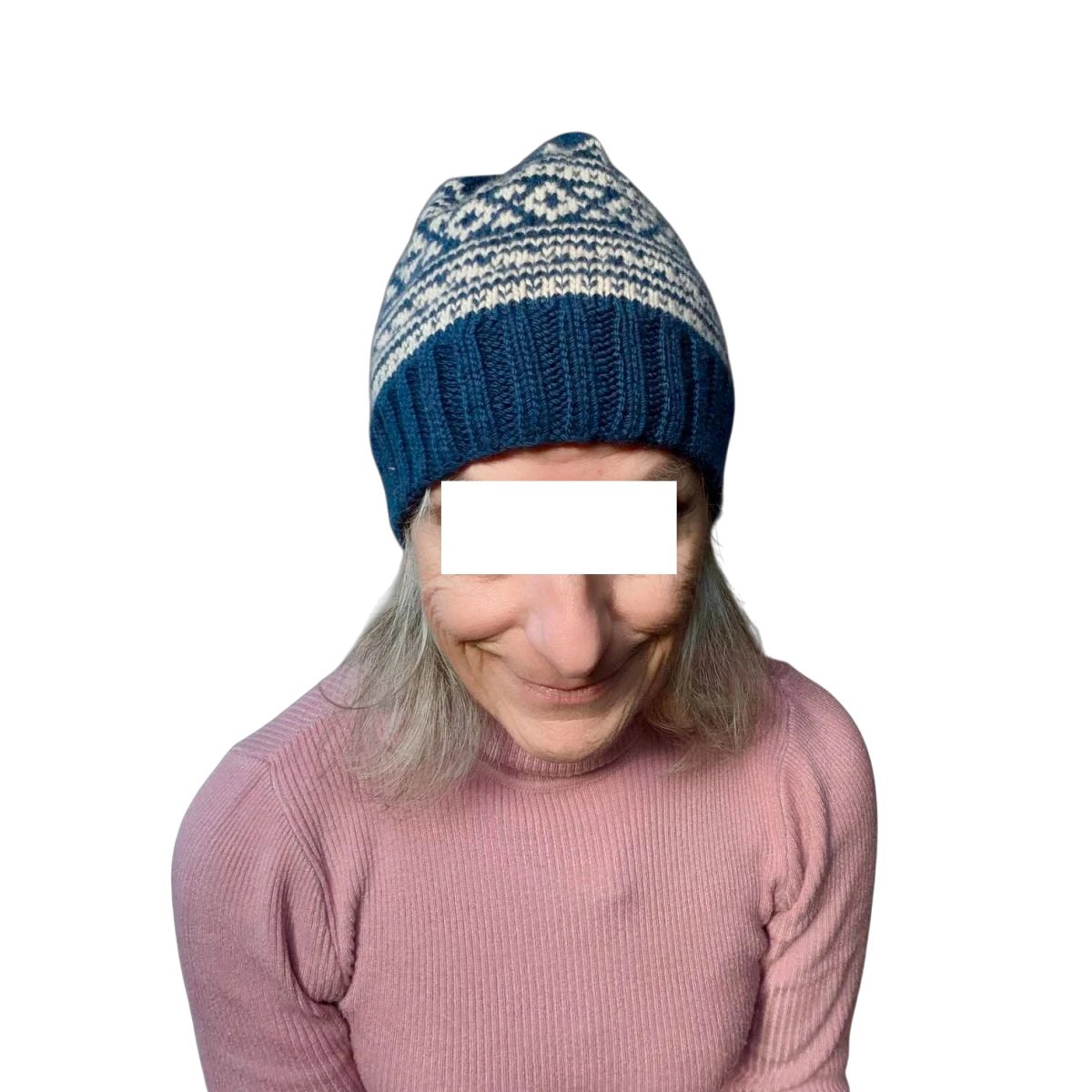 Bonnet nordique bleu et beige en pure laine mérinos. Je l'ai tricoté en suivant un motif traditionnel islandais. Il mesure 25cm de haut et s'adapte à un tour de tête de 54 à 60 cm. C'est un modèle original qui ajoute une touche de fantaisie aux tenues hivernales.