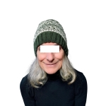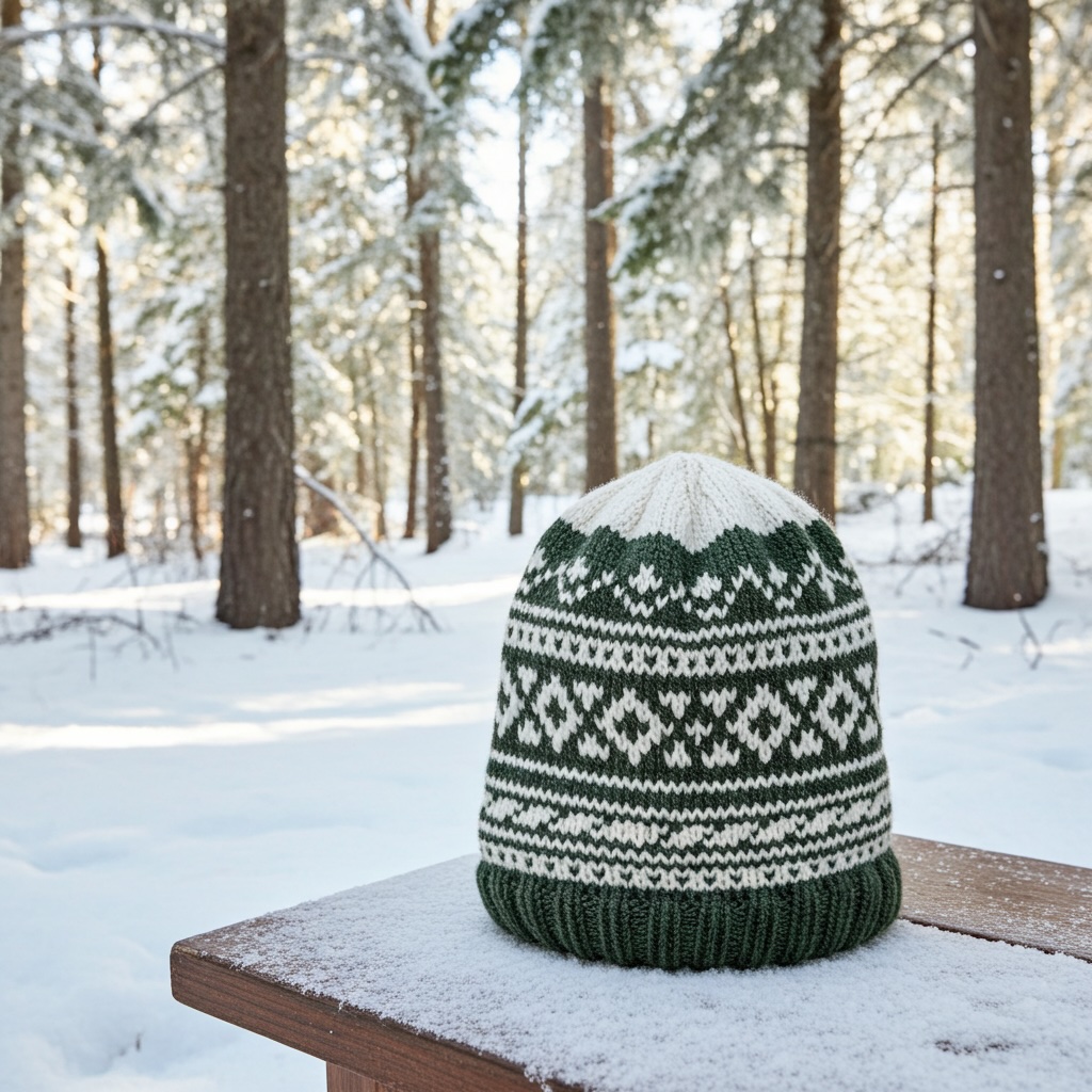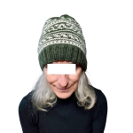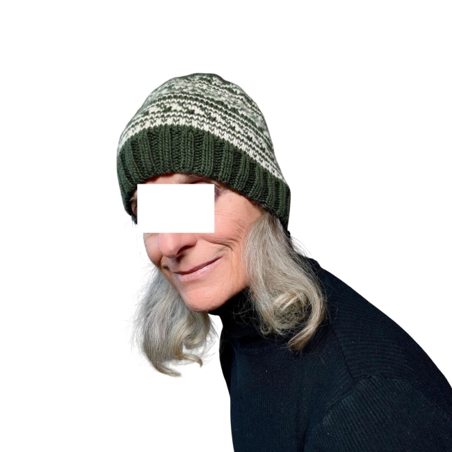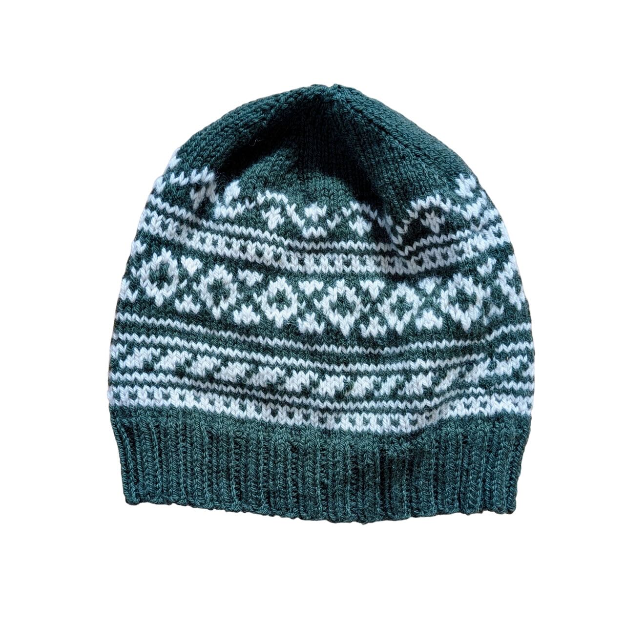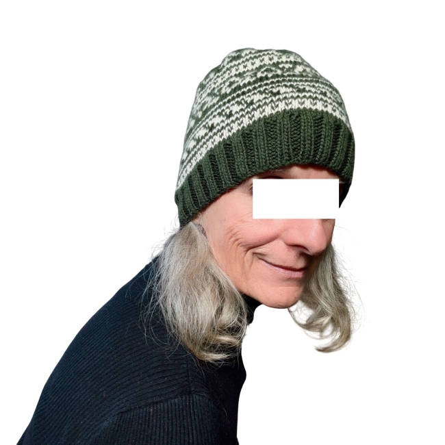 Bonnet nordique vert et beige en pure laine mérinos. Je l'ai tricoté en suivant un motif traditionnel islandais. Il mesure 25cm de haut et s'adapte à un tour de tête de 54 à 60 cm. C'est un modèle original qui ajoute une touche de fantaisie aux tenues hivernales.