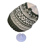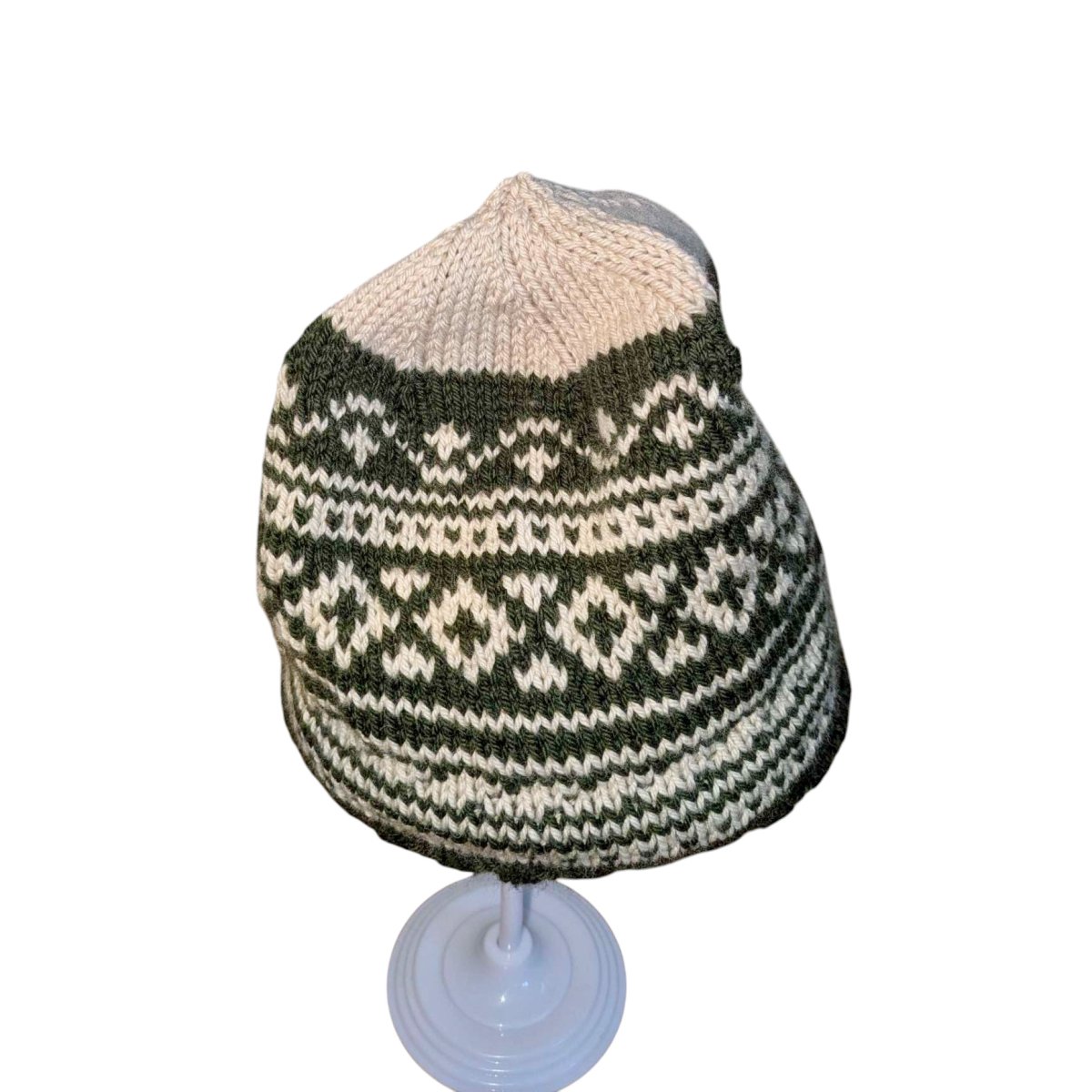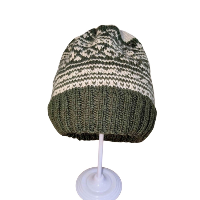 Bonnet nordique vert et beige en pure laine mérinos. Je l'ai tricoté en suivant un motif traditionnel islandais. Il mesure 25cm de haut et s'adapte à un tour de tête de 54 à 60 cm. C'est un modèle original qui ajoute une touche de fantaisie aux tenues hivernales.