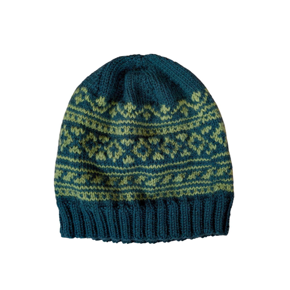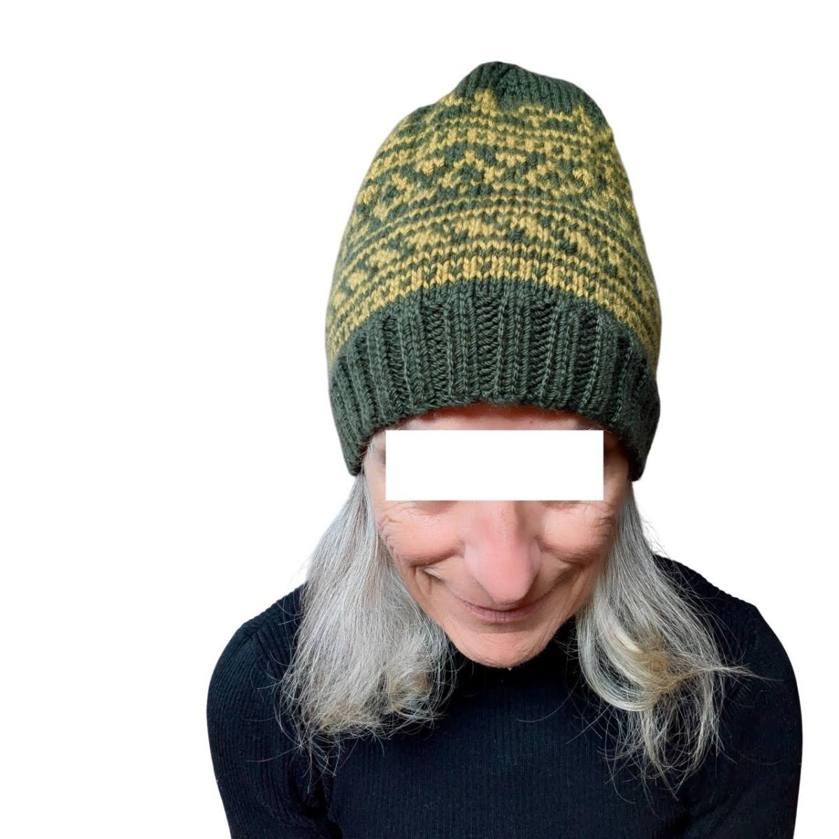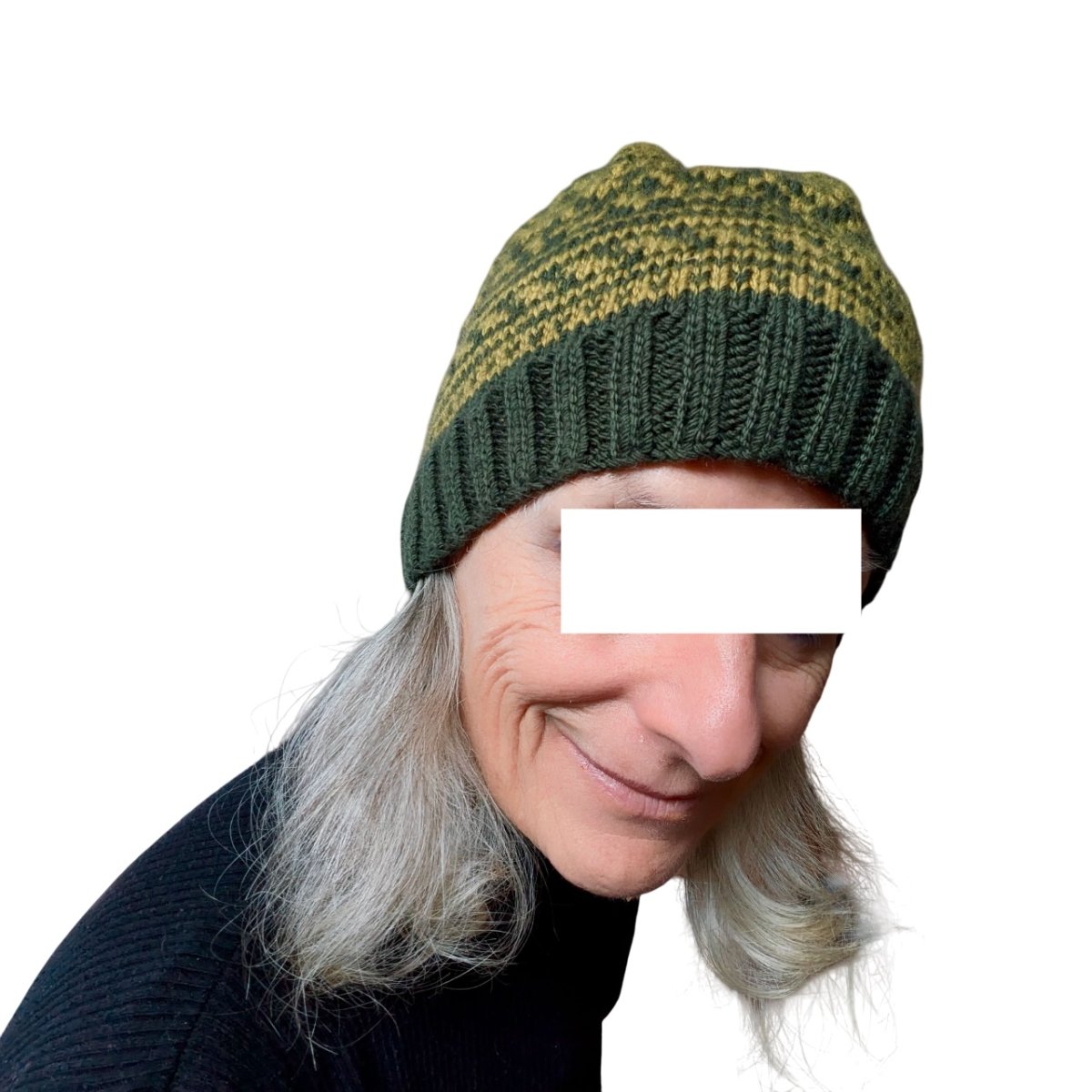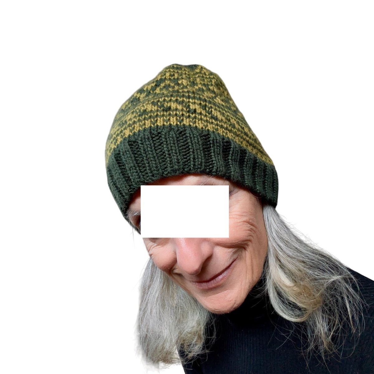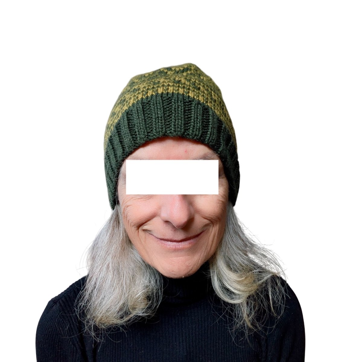 Bonnet nordique vert forêt et vert olive en pure laine mérinos. Je l'ai tricoté en suivant un motif traditionnel islandais. Il mesure 25cm de haut et s'adapte à un tour de tête de 54 à 60 cm. C'est un modèle original qui ajoute une touche de fantaisie aux tenues hivernales.