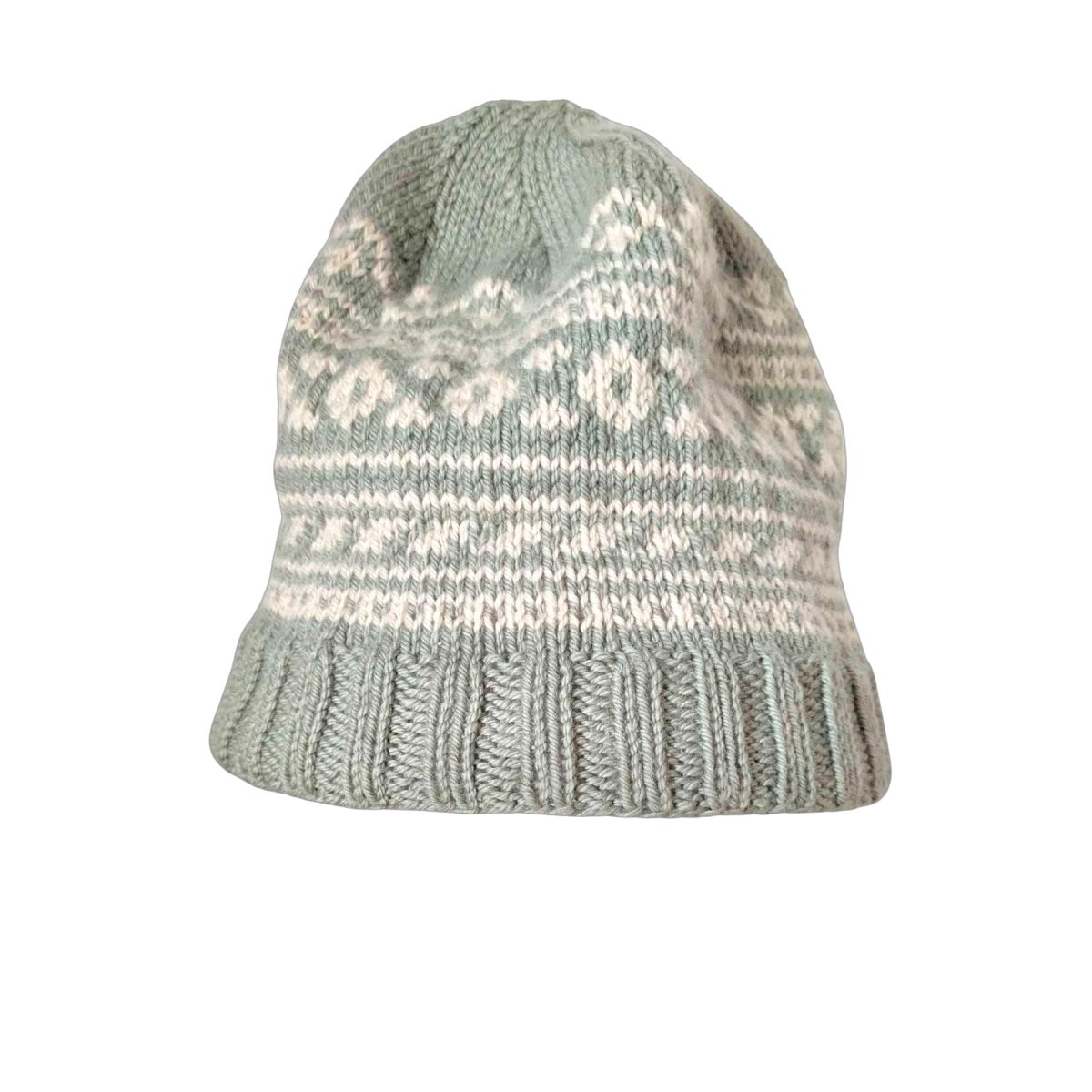 Bonnet nordique vert amande et beige en pure laine mérinos. Je l'ai tricoté en suivant un motif traditionnel islandais. Il mesure 25cm de haut et s'adapte à un tour de tête de 54 à 60 cm. C'est un modèle original qui ajoute une touche de fantaisie aux tenues hivernales.