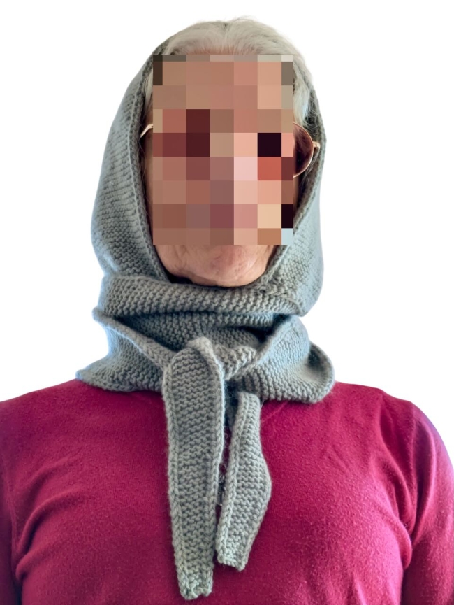 La cagoule est taille unique et va pour un tour de tête de 56 à 60 cm. Quant à l'écharpe, chaque bout mesure environ 80 cm. Ce qui permet de bien l'enrouler autour du cou et de l'attacher.