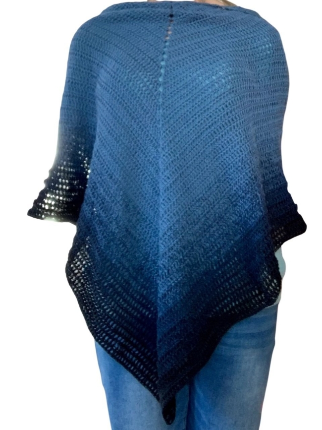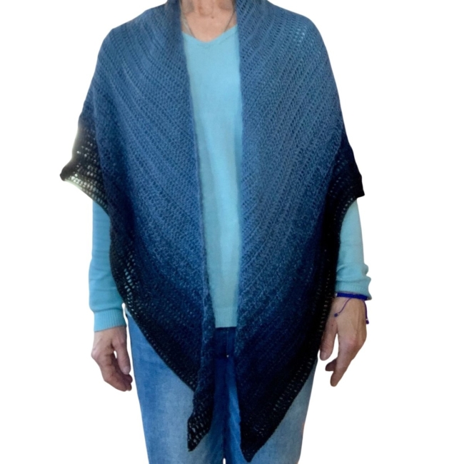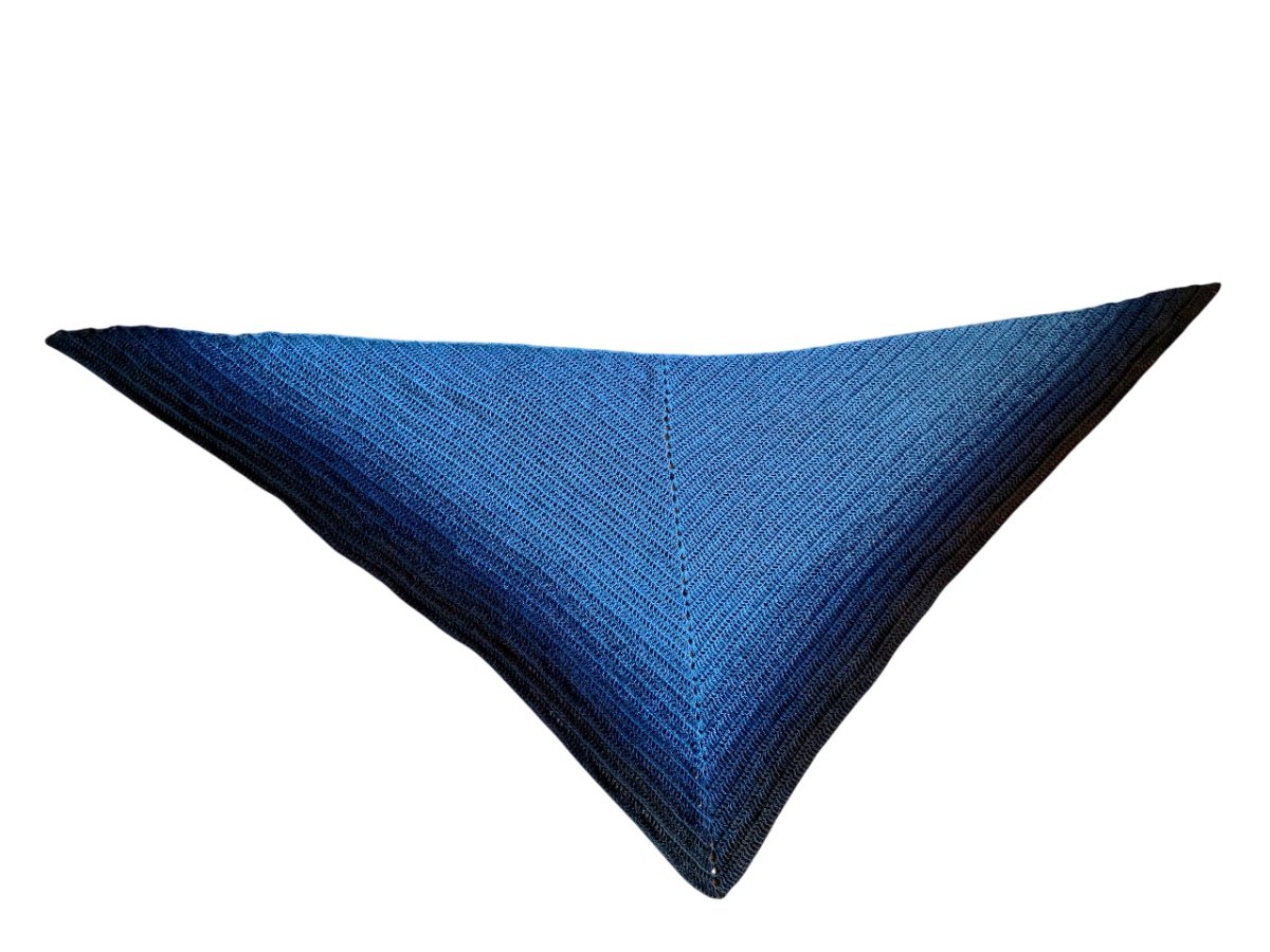 Le châle mesure 179cm d'envergure et 75cm de largeur à la pointe. Lavable à 30 degrés à la machine programme doux sans adoucissant car cela casse les fibres du coton. Ne pas le mettre dans une sécheuse mais étendre le châle à plat pour le sécher.