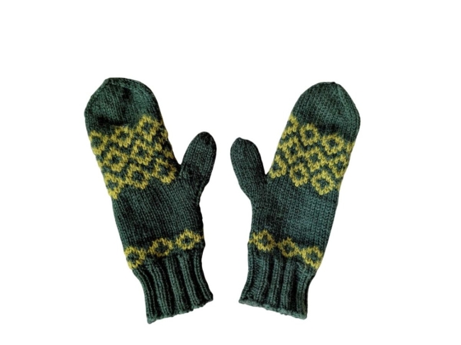 Moufles nordiques vert et vert olives en pure laine mérinos, taille S. Je les ai tricotées en utilisant la technique du jacquard, c'est à dire tricoter avec deux pelotes de laine de couleur différentes.