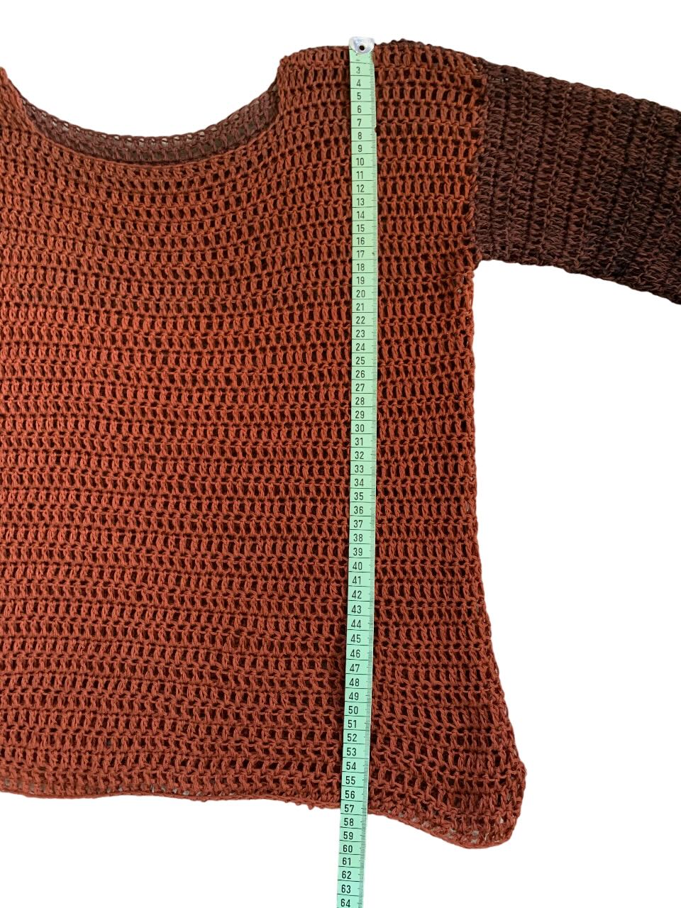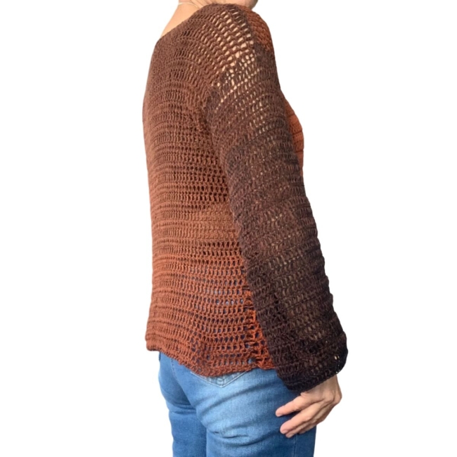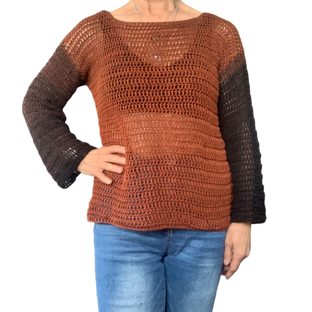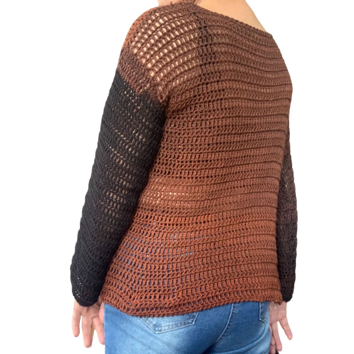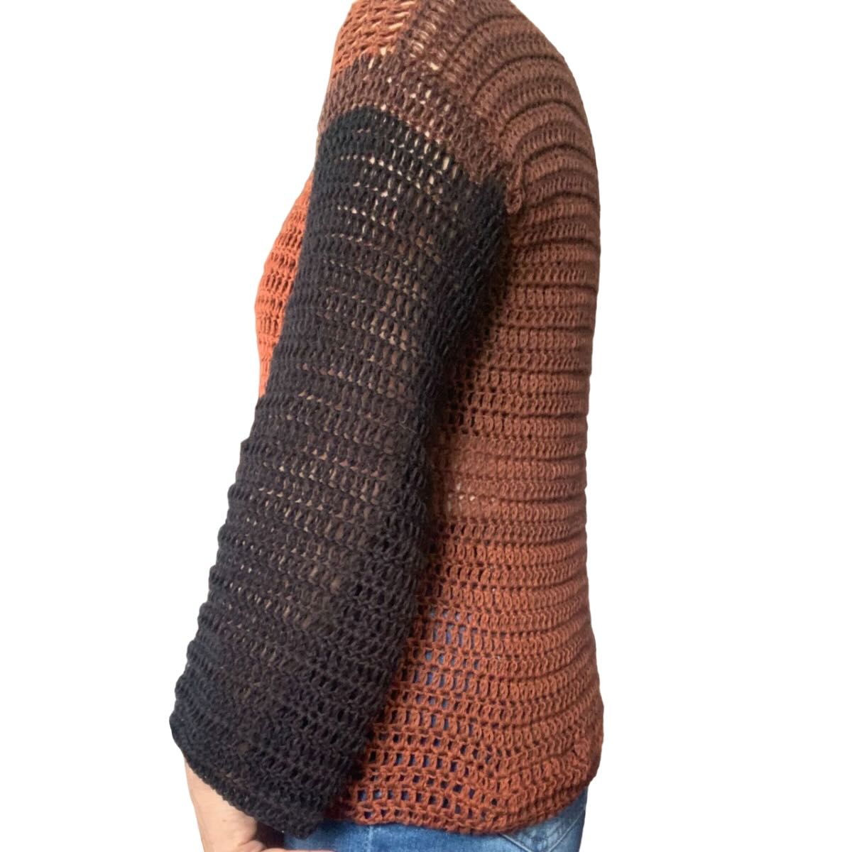 Pull fait main au crochet en pur coton brun cognac-noir taille M. Ce pull crocheté par mes soins est dans la tendance des couleurs de cet automne-hiver, c'est à dire : brun cognac.