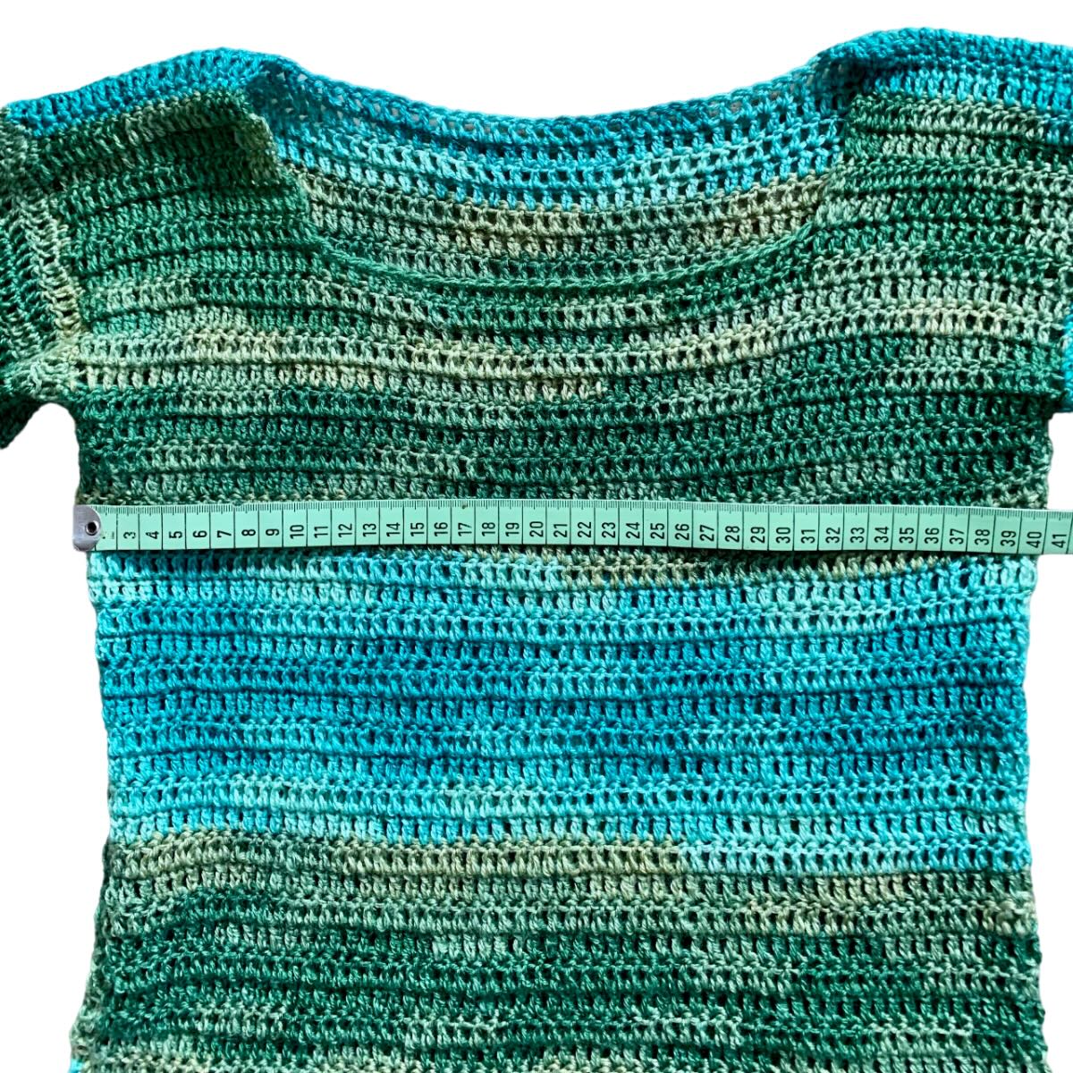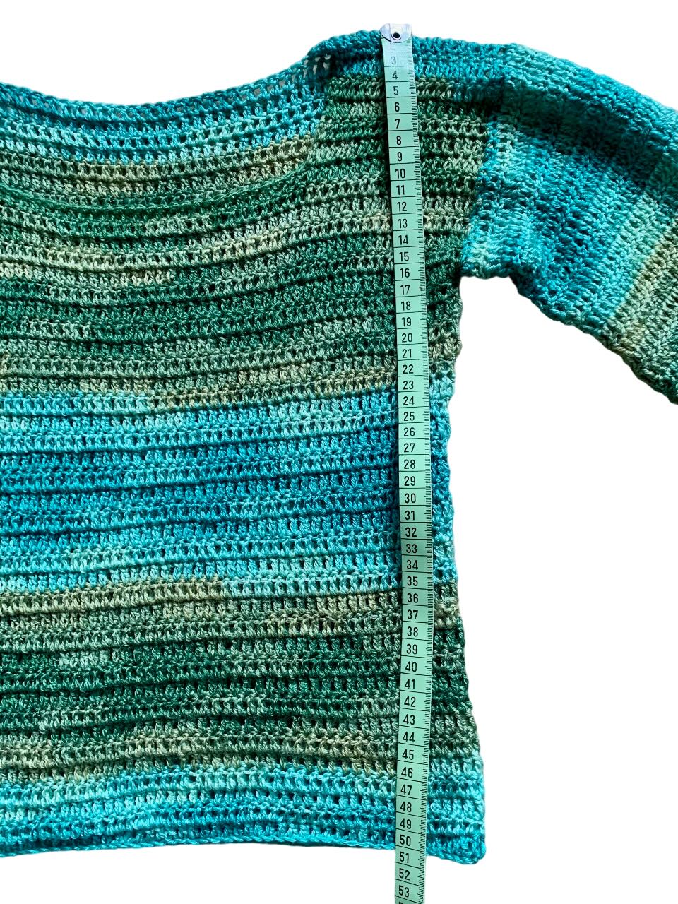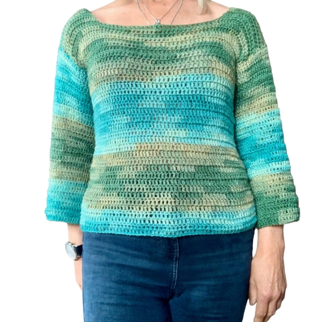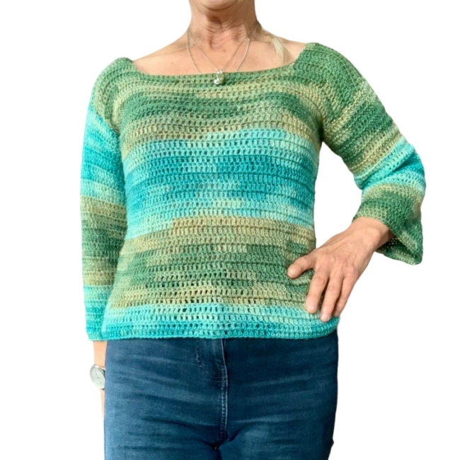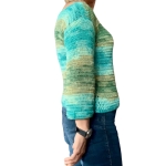 Pull au crochet vert olive-turquoise dégradé en mérinos et acrylique, 30% et 70%. Ce mélange est particulièrement doux sur la peau.