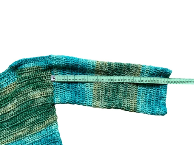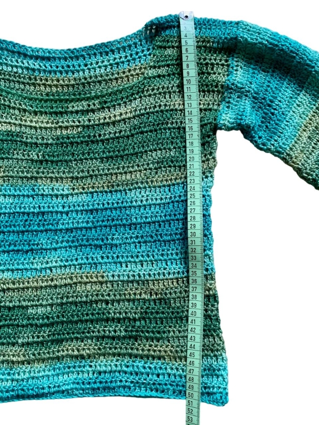 Le pull est parfait au printemps et en automne. Il mesure 50cm de long et 40 cm de large ce qui est équivaut à 80-82 cm de tour de poitrine. Les manches sont trois-quart et mesurent 36 cm de long.