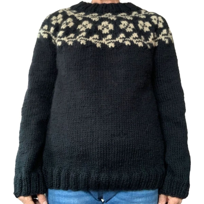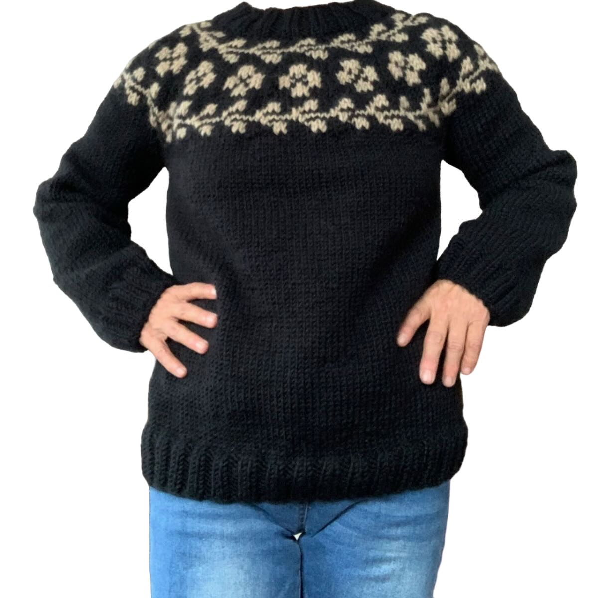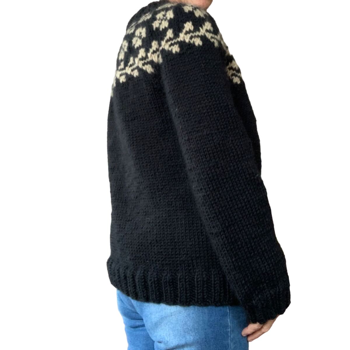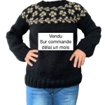 Pull nordique noir-beige taille M en pure laine. Tricoté par mes soins en Suisse dans le Valais, ce pull est très dpux et vous tiendra bien au chaud.