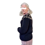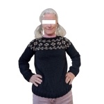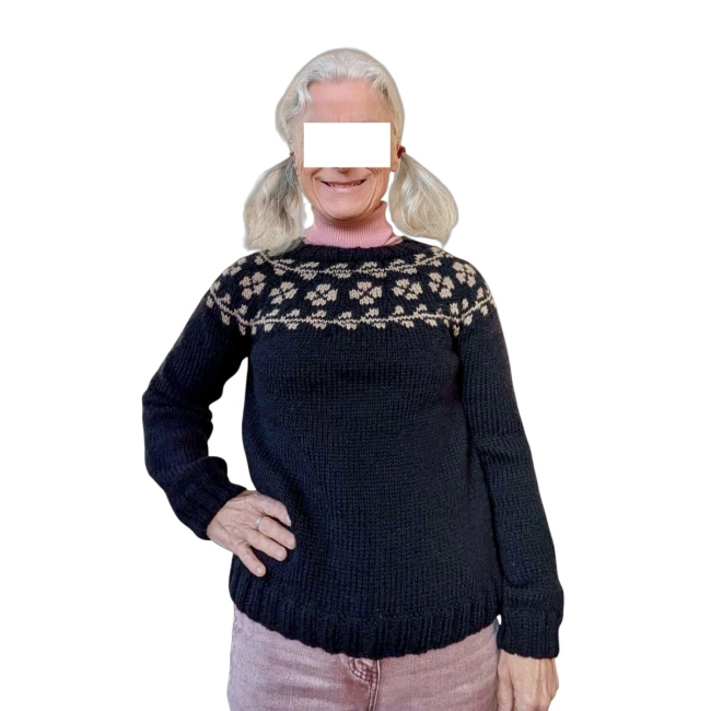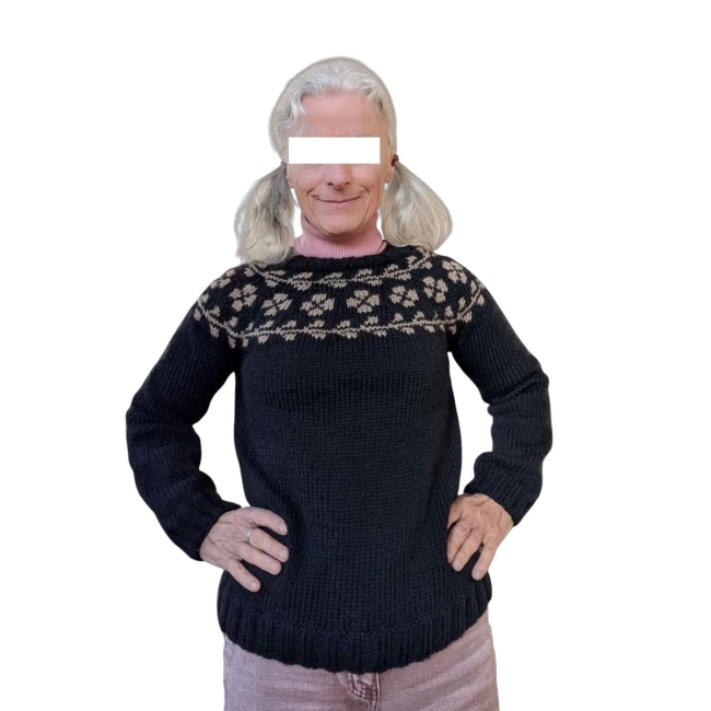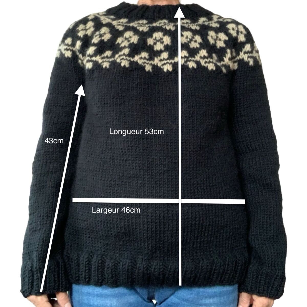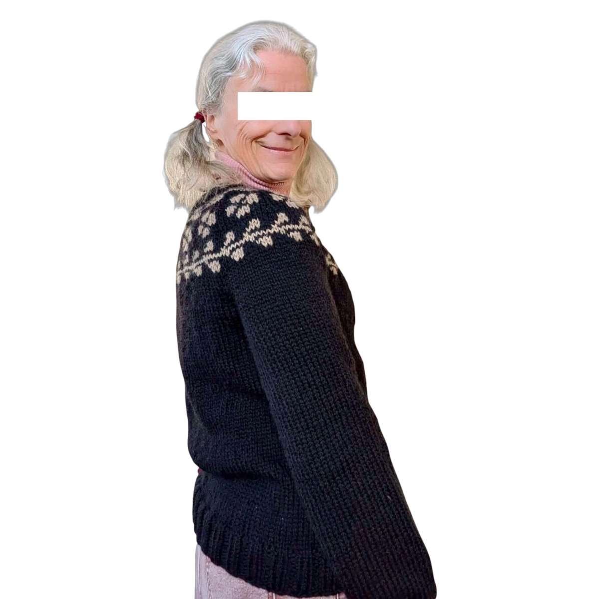 Pull nordique noir-beige taille S en pure laine. Tricoté par mes soins en Suisse dans le Valais, ce pull est très doux et vous tiendra bien au chaud.