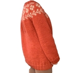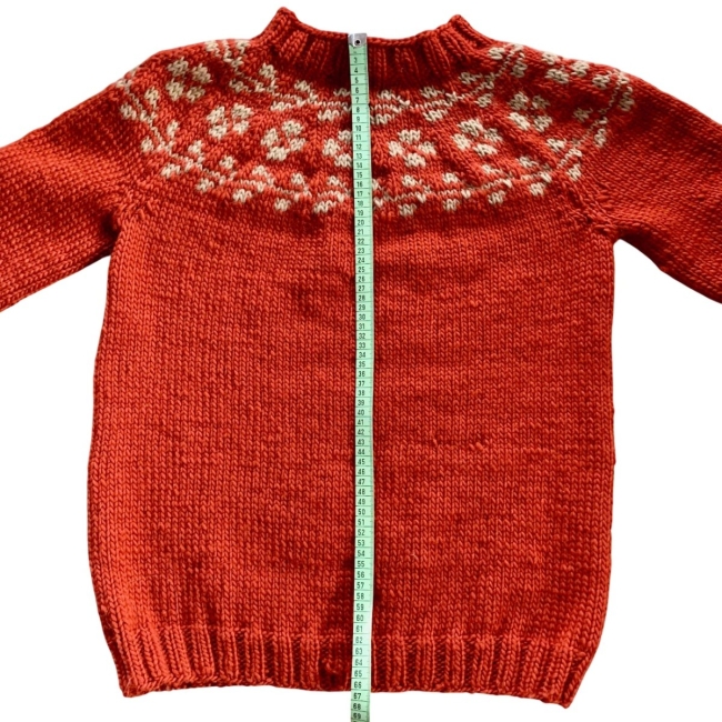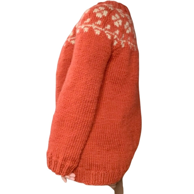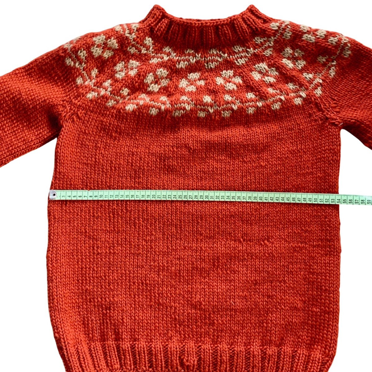 Pull nordique orange et beige taille L que j'ai tricoté à la main avec de la pure laine très douce sur la peau. Il mesure 66 cm de long depuis le col. Largeur : 54 cm et les manches sont longues de 45 cm depuis l'emmanchure.